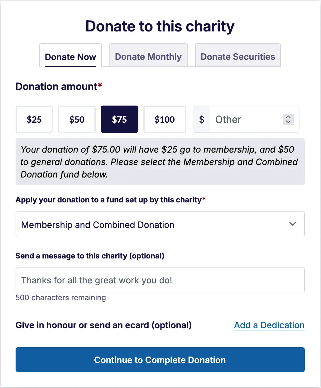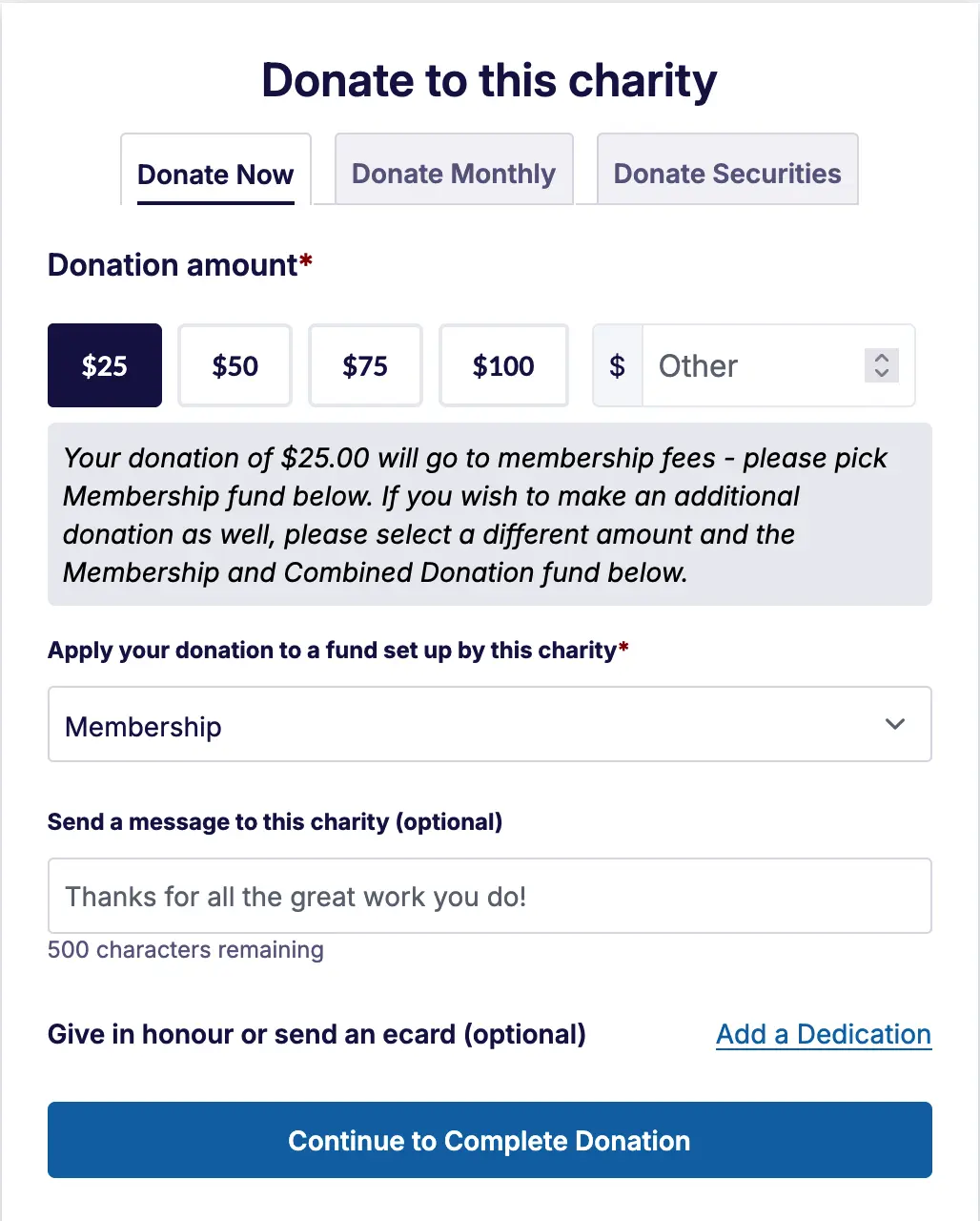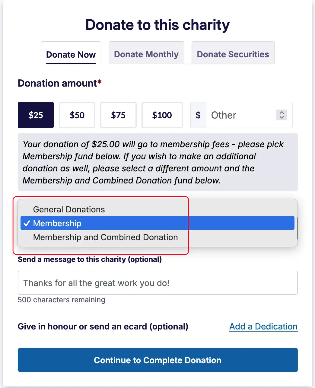 To purchase or renew a single membership to CareNow Ontario select $25 from the “Donation Amount” box then select “Memberships” from the drop-down menu in the “Apply your donation to a fund set up by this charity” box.